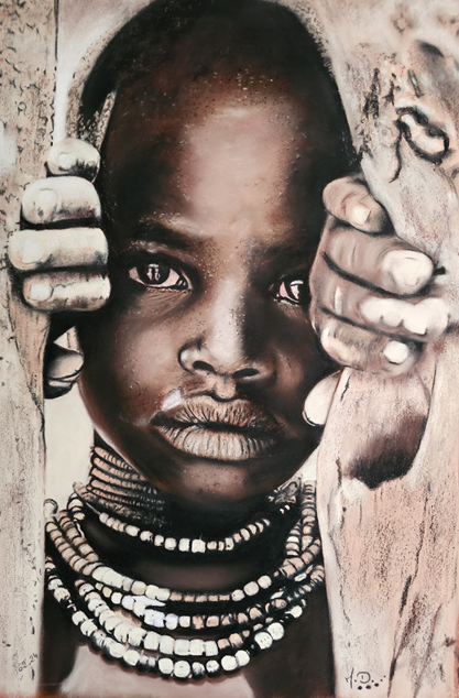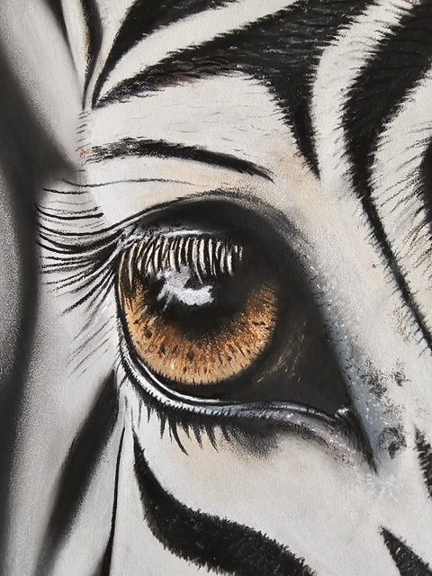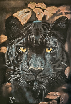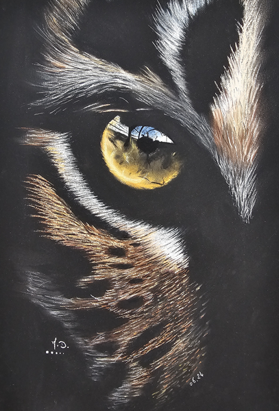 années et mets de côté ma passion artistique pour également fonder ma famille et suivre un chemin assez conventionnel. Mais peu après 40 ans, un burn-out me rappelle que la vie est courte et qu'il faut suivre ses rêves! Je reprends alors des cours, retrouve le goût intense de dessiner et commence à produire essentiellement des portraits, centrés sur l'étude du regard, de sa profondeur et de ce qu'il révèle sur les êtres vivants. J'approfondis ma technique du pastel, découvre la pierre noire et me lance récemment dans l'aquarelle. Celle-ci me permet de lâcher prise! J'ai fait quelques expositions qui m'ont poussée à sortir de ma zone de confort et montrer au grand jour ce qui restait caché jusque-là! Je me suis également formée en autodidacte au tatouage, que je pratique également en parallèle!