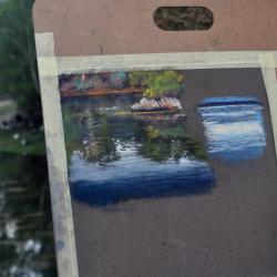- 2- La transparence. Vu depuis la berge, le plan d'eau laisse transparaître à travers son miroir le dessous de la surface, pierres et algues peu profondes... qui viennent se mêler aux images reflétées. Comment aborder le rapport dessus/dessous dans une même image. Comprendre les valeurs des couleurs rencontrées, qui permettent de rendre lisible une image complexe. Travail en atelier puis en extérieur.